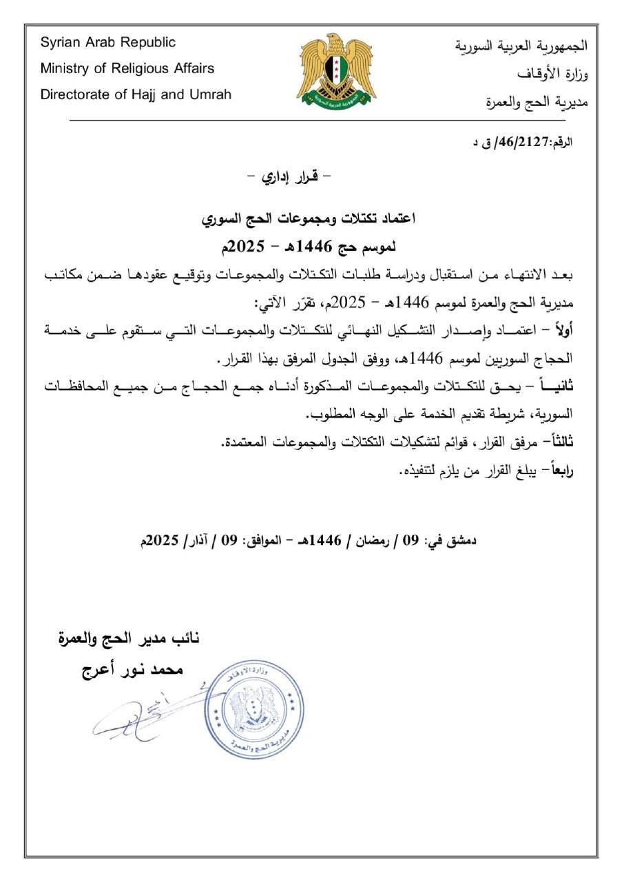 أولاً - اعتماد وإصدار التشكيل النهائي للتكتلات والمجموعات التي ستقوم على خدمة الحجاج السوريين لموسم 1446هـ ، ووفق الجدول المرفق بهذا القرار .
