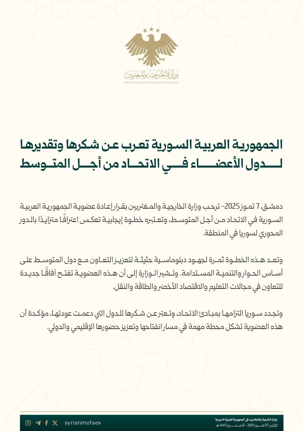 دمشق، 7 تموز 2025 - ترحب وزارة الخارجية والمغتربين بقرار إعادة عضوية الجمهورية العربية السورية في الاتحاد من أجل المتوسط، وتعتبره خطوة إيجابية تعكس اعترافا متزايدًا بالدور المحوري لسوريا في المنطقة.