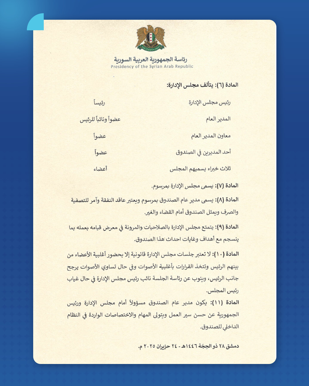 المادة (11): يكون مدير عام الصندوق مسؤولاً أمام مجلس الإدارة ورئيس الجمهورية عن حسن سير العمل ويتولى المهام والاختصاصات الواردة في النظام الداخلي للصندوق.