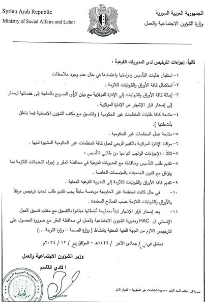 -۱۱ بعد إصدار قرار الإشهار تبدأ بممارسة أنشطتها مباشرة بالتنسيق مع مكتب تنسيق العمل الإنساني ال HAC ومديرية الشؤون الاجتماعية والعمل في محافظة المقر مع ضرورة الحصول على الترخيص اللازم من الجهة الفنية المعنية بالنشاط ) وزارة الصحة - وزارة التربية ...)