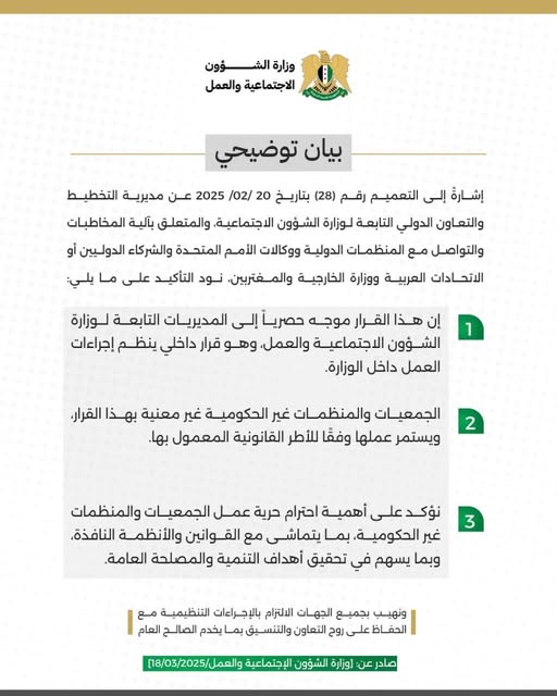 إشارة إلى التعميم رقم (28) بتاريخ 2025/02/20 عن مديرية التخطيط والتعاون الدولي التابعة لوزارة الشؤون الاجتماعية والمتعلق بآلية المخاطبات والتواصل مع المنظمات الدولية ووكالات الأمم المتحدة والشركاء الدوليين أو الاتحادات العربية ووزارة الخارجية والمغتربين نود التأكيد على ما يلي: