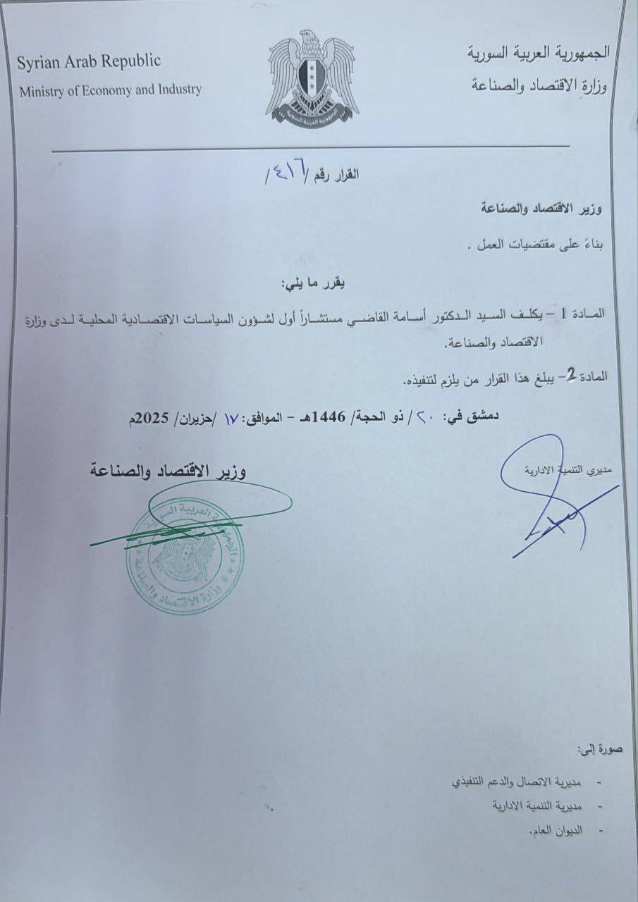وزارة الاقتصاد والصناعة: قرار تعيين أسامة القاضي مستشاراً أول لشؤون السياسات الاقتصادية المحلية