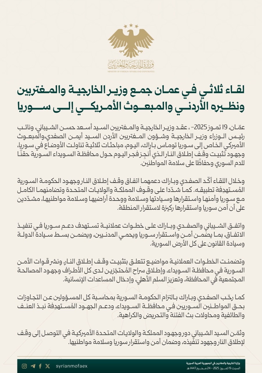 عمان، 19 تموز 2025 ، عقد وزير الخارجية والمغتربين السيد أسعد حسن الشيباني، ونائب رئيس الوزراء وزير الخارجية وشؤون المغتربين الأردن السيد أيمن الصفدي، والمبعوث الأميركي الخاص إلى سوريا توماس باراك، اليوم، مباحثات ثلاثية تناولت الأوضاع في سوريا، وجهود تثبيت وقف إطلاق النار الذي أنجز فجر اليوم حول محافظة السويداء السورية حقنا للدم السوري وحفاظا على سلامة المواطنين.