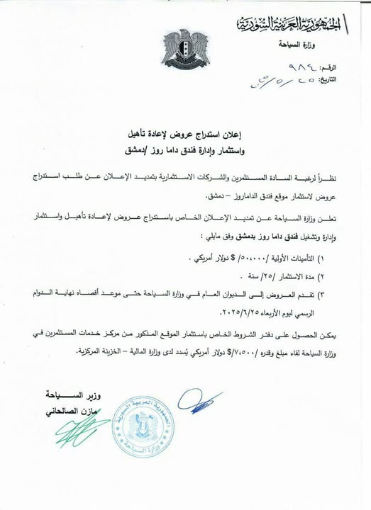 نظراً لرغبة السادة المستثمرين والشركات الاستثمارية بتمديد الإعلان عن طلب استدراج عروض الاستثمار موقع فندق الداماروز - دمشق.
