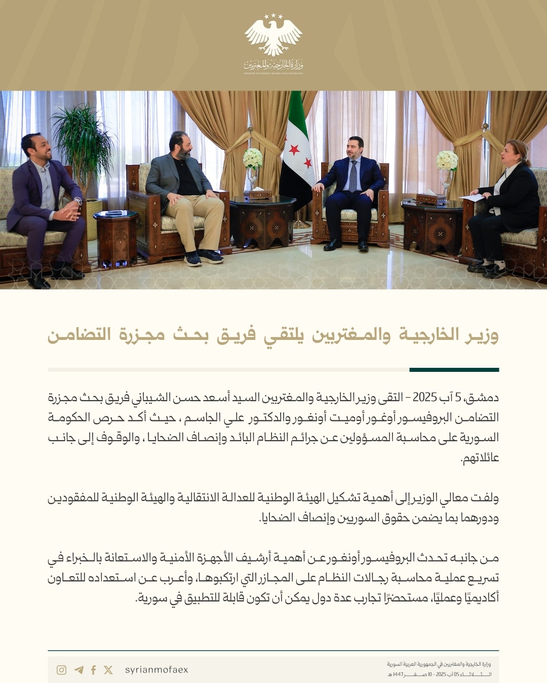دمشق، 5 آب 2025 - التقى وزير الخارجية والمغتربين السيد أسعد حسن الشيباني فريق بحث مجزرة التضامن البروفيسور أوغور أوميت أونغور والدكتور علي الجاسم، حيث أكد حرص الحكومة السورية على محاسبة المسؤولين عن جرائم النظام البائد وإنصاف الضحايا ، والوقوف إلى جانب عائلاتهم.