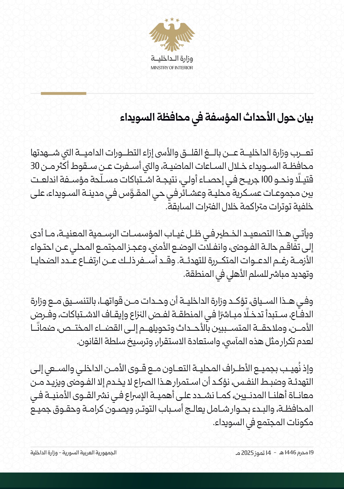 تعرب وزارة الداخلية عن بالغ القلق والأسى إزاء التطورات الدامية التي شهدتها محافظة السويداء خلال الساعات الماضية، والتي أسفرت عن سقوط أكثر من 30 قتيلا ونحو 100 جريح في إحصاء أولي، نتيجة اشتباكات مسلحة مؤسفة اندلعت بين مجموعات عسكرية محلية وعشائر في حي المقوس في مدينة السويداء، على خلفية توترات متراكمة خلال الفترات السابقة.