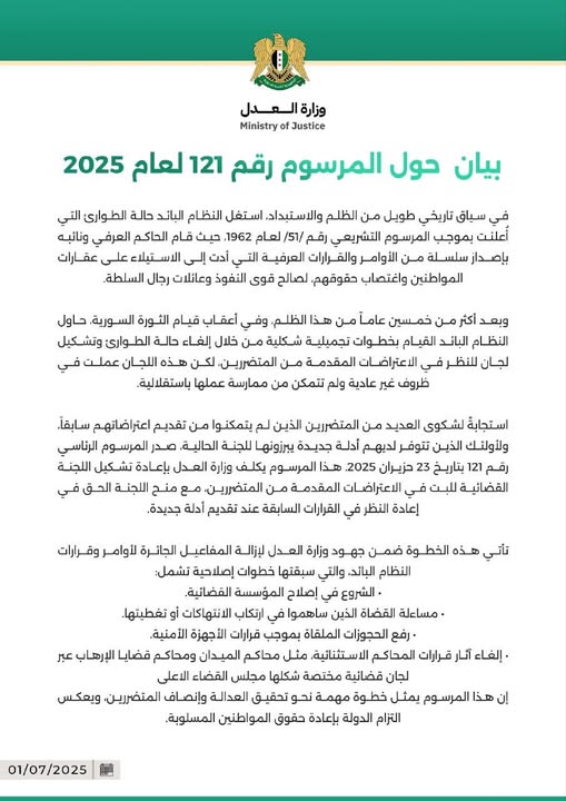 بيان حول المرسوم رقم 121 لعام 2025