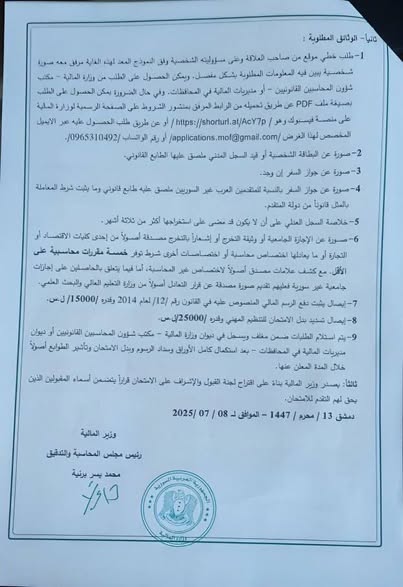 تعلن وزارة المالية - مكتب شؤون المحاسبين القانونيين - عن استقبال طلبات الراغبين للتقدم لامتحان نيل شهادة محاسب قانوني ممن لم يتمكنوا من التسجيل في الدورة الاستثنائية مع دورة 2024 للامتحان، من كل المحافظات السورية وخاصة من المناطق الشمالية والشرقية التي كانت خارج سيطرة النظام البائد. ممن تتوفر لديهم الشروط المنصوص عليها في القانون /33/ لعام 2009 المتضمن تنظيم مهنة المحاسبة والتدقيق والضوابط المقررة من مجلس المحاسبة والتدقيق خلال الفترة من تاريخ التعميم 105/ تا تاريخ 2025/7/5 ولغاية نهاية دوام الخميس 2025/7/24