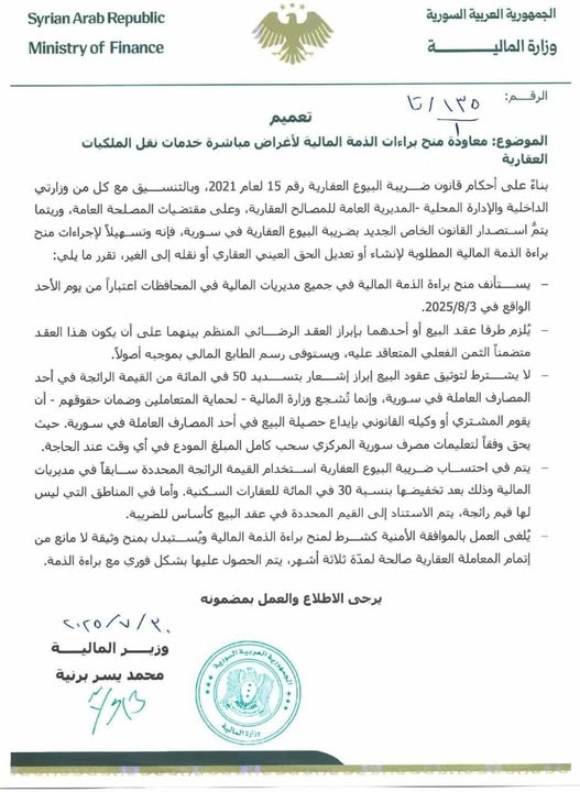 يستأنف منح براءة الذمة المالية في جميع مديريات المالية في المحافظات اعتباراً من يوم الأحد 2025/8/3 الواقع في