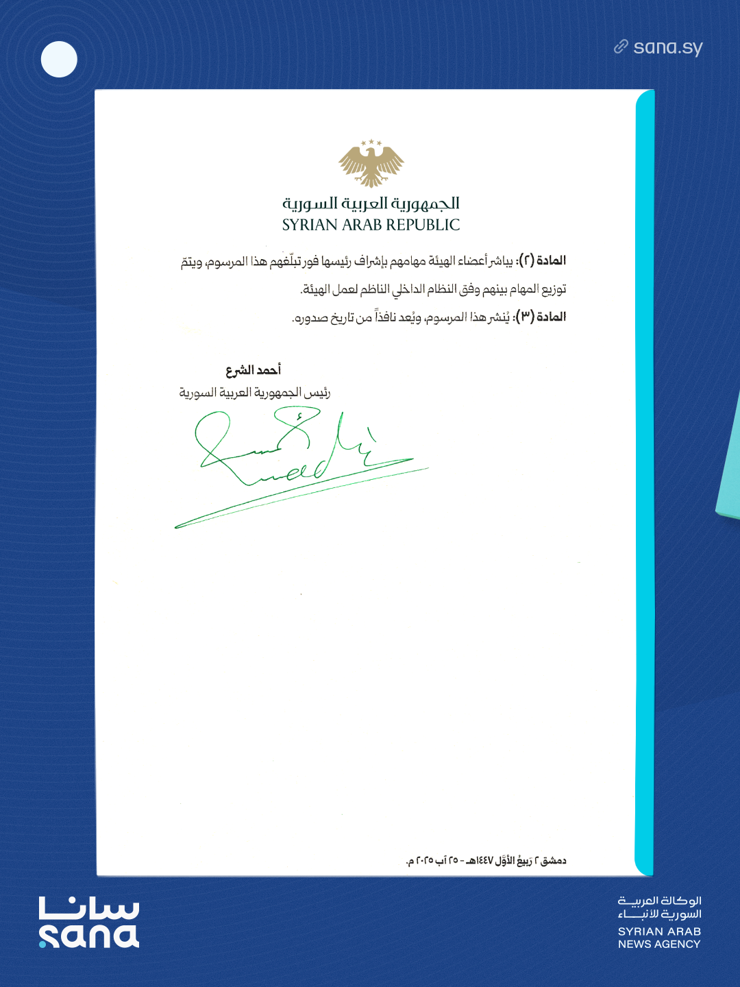 السيد الرئيس أحمد الشرع يصدر المرسوم رقم (149) لعام 2025 القاضي بتشكيل لجنة الهيئة الوطنية للعدالة الانتقالية