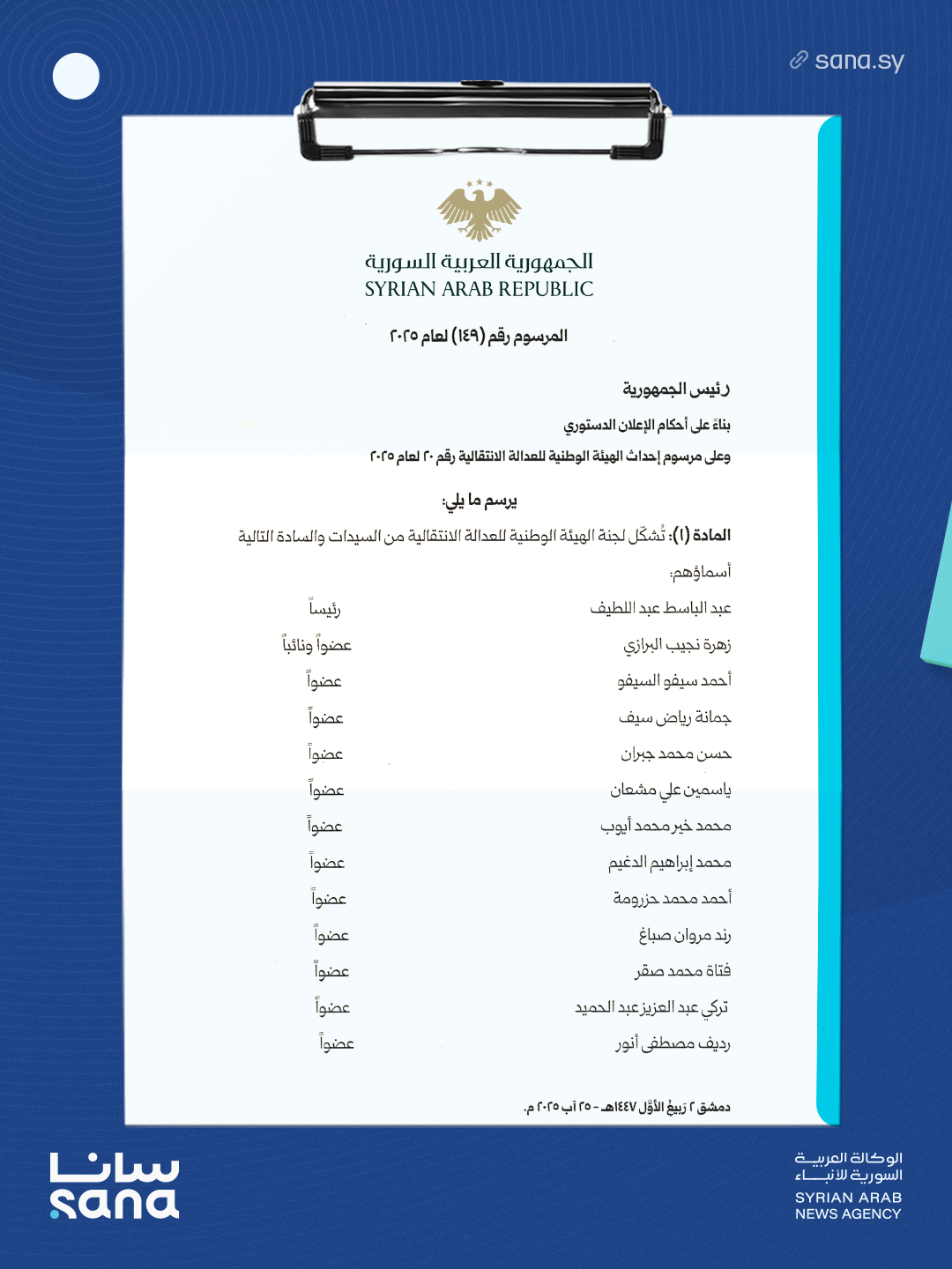 بناءً على أحكام الإعلان الدستوري وعلى مرسوم إحداث الهيئة الوطنية للعدالة الانتقالية رقم 20 لعام 2025