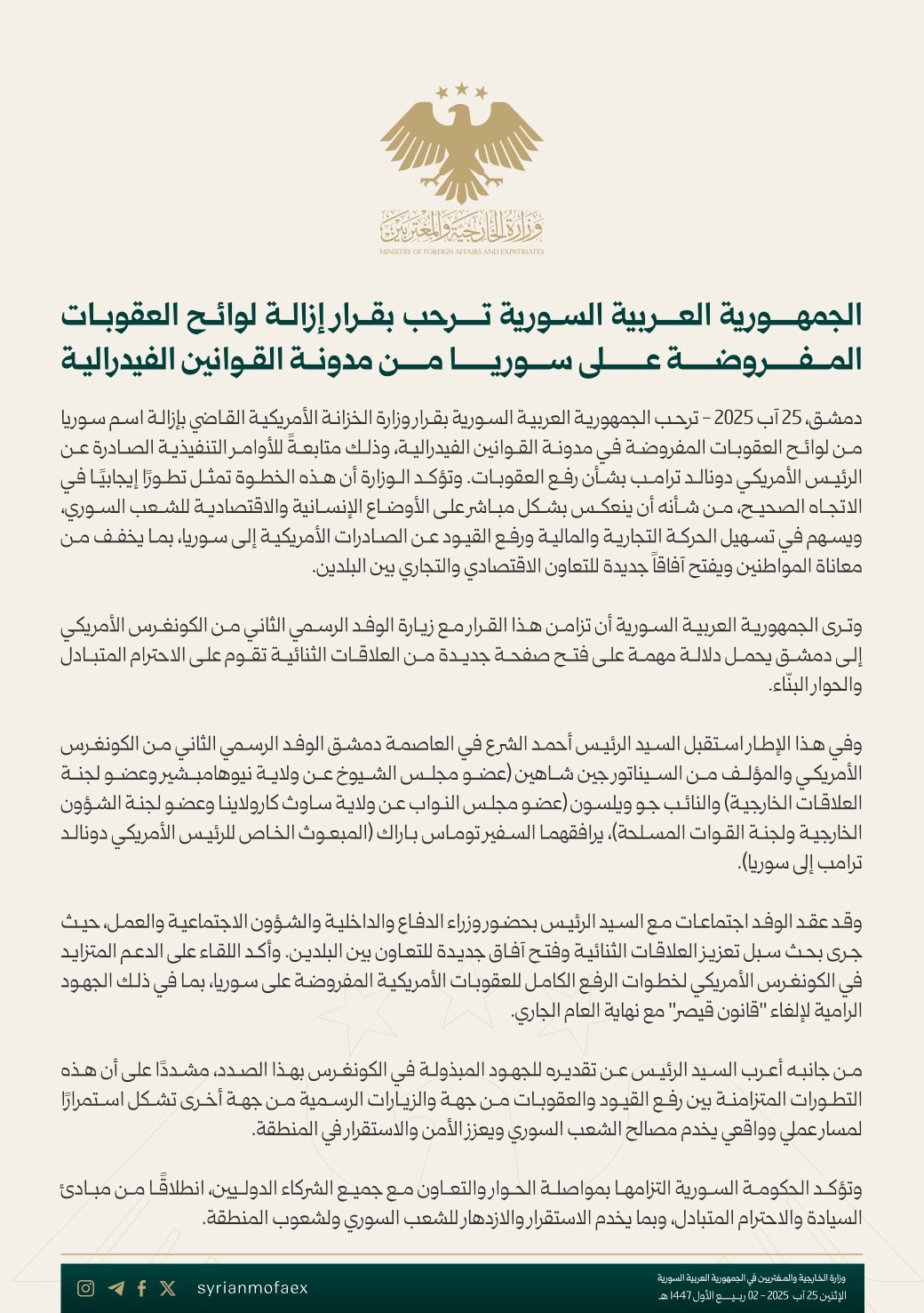 وترى الجمهورية العربية السورية أن تزامن هذا القرار مع زيارة الوفد الرسمي الثاني من الكونغرس الأمريكي إلى دمشق يحمل دلالة مهمة على فتح صفحة جديدة من العلاقات الثنائية تقوم على الاحترام المتبادل والحوار البناء.