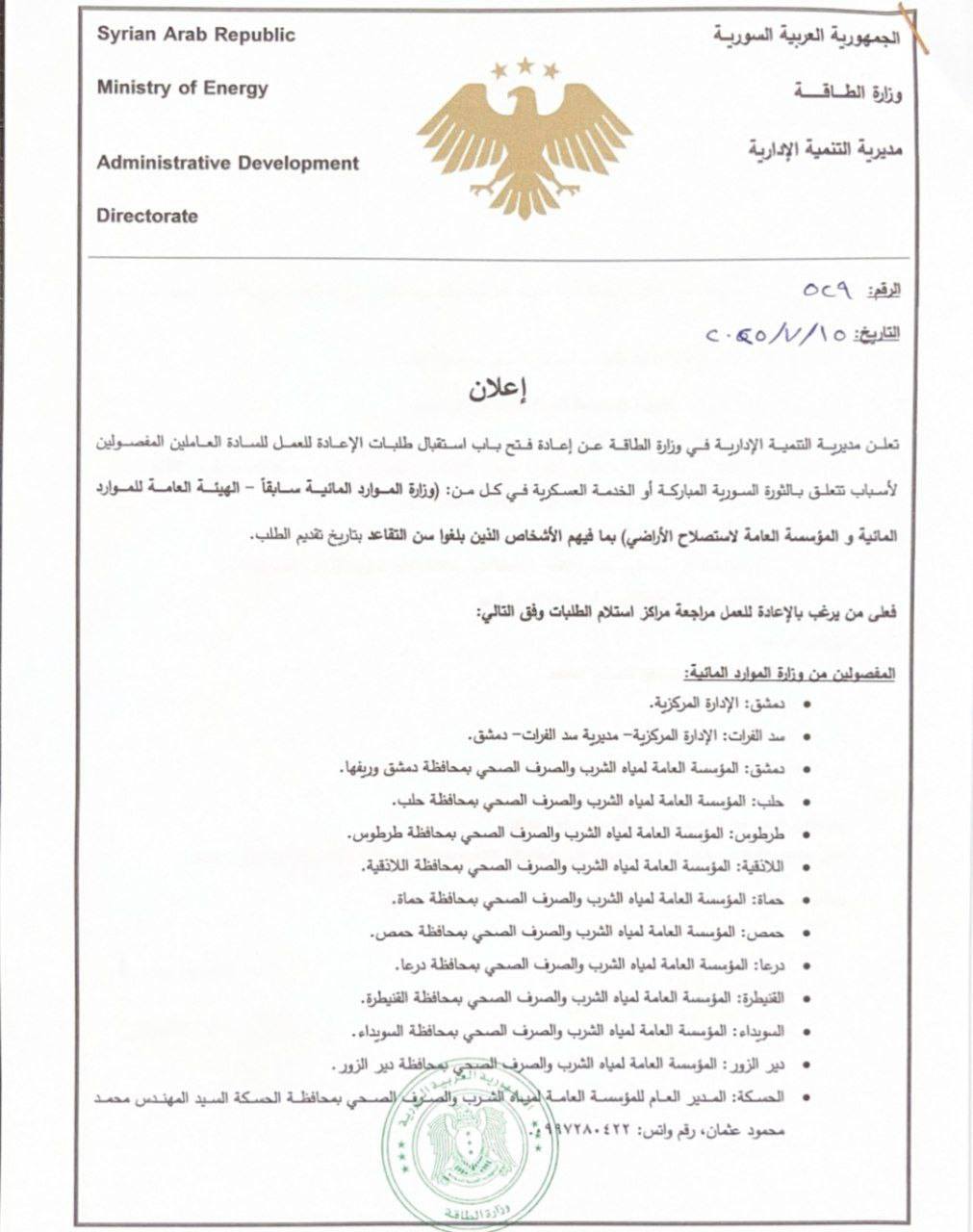 تعلن مديرية التنمية الإدارية في وزارة الطاقة عن إعادة فتح باب استقبال طلبات الإعادة للعمل للسادة العاملين المفصولين الأسباب تتعلق بالثورة السورية المباركة أو الخدمة العسكرية في كل من وزارة الموارد المائية سابقاً - الهيئة العامة للموارد المائية و المؤسسة العامة لاستصلاح الأراضي بما فيهم الأشخاص الذين بلغوا سن التقاعد بتاريخ تقديم الطلب.