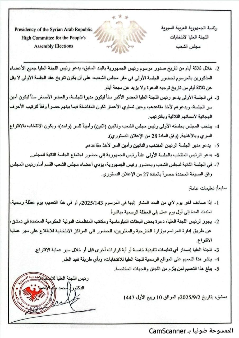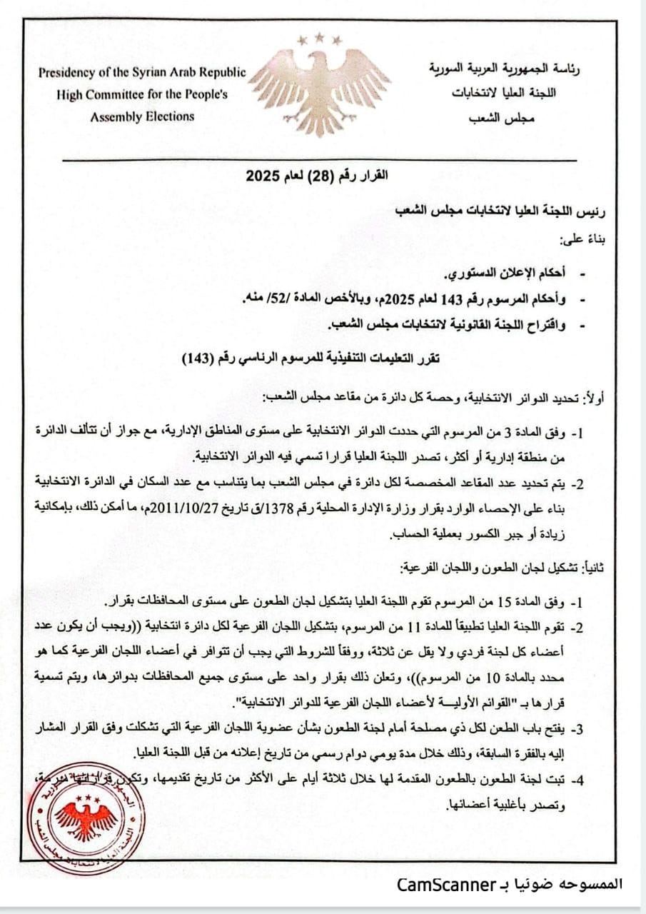 اللجنة العليا لانتخابات مجلس الشعب تُصدر القرار رقم /28/ لعام 2025 والمتضمن التعليمات التنفيذية للمرسوم الرئاسي رقم 143 الخاص بقانون الانتخابات المؤقت.