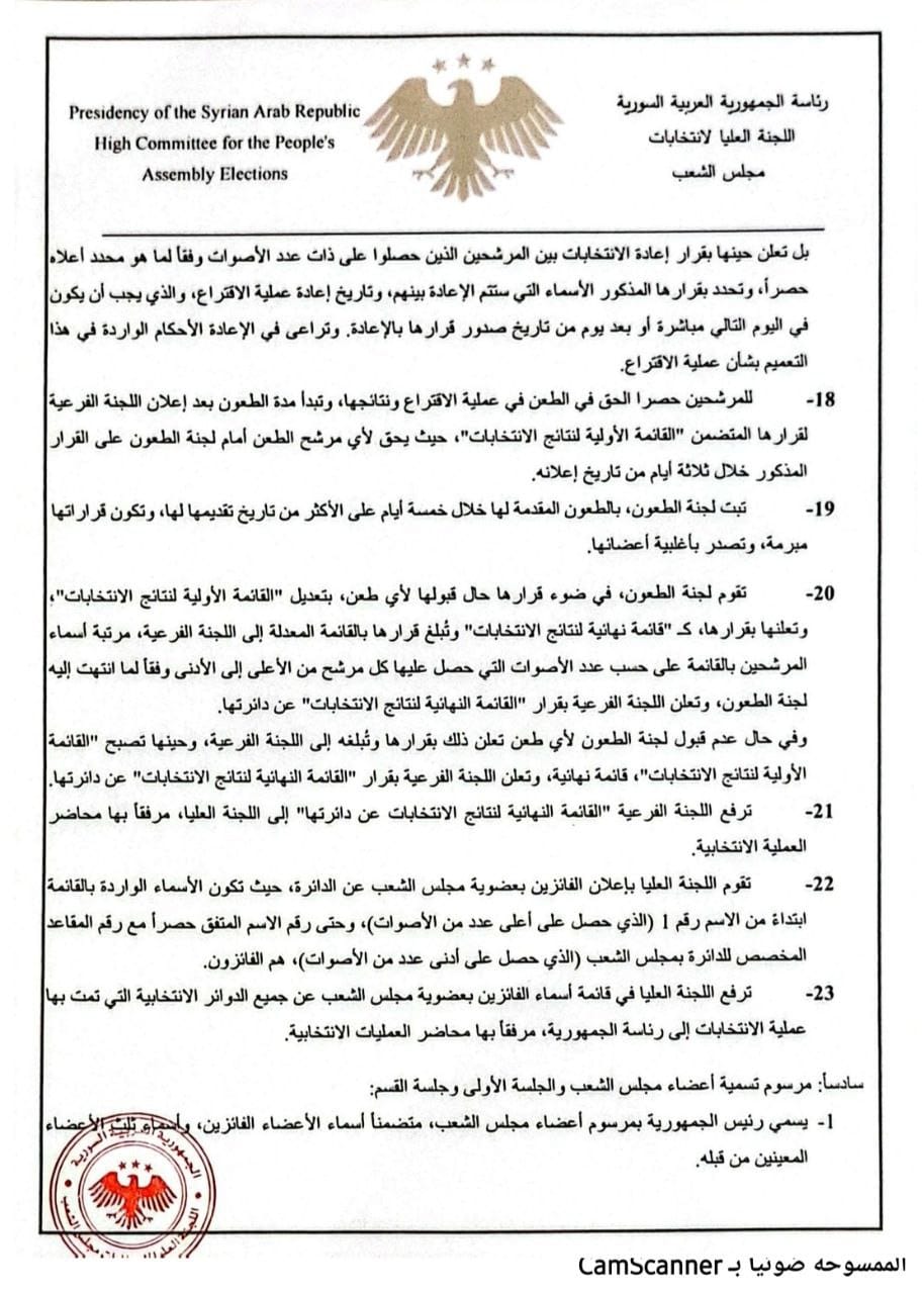 23- ترفع اللجنة العليا في قائمة أسماء الفائزين بعضوية مجلس الشعب عن جميع الدوائر الانتخابية التي تمت بها عملية الانتخابات إلى رئاسة الجمهورية، مرفقاً بها محاضر العمليات الانتخابية.