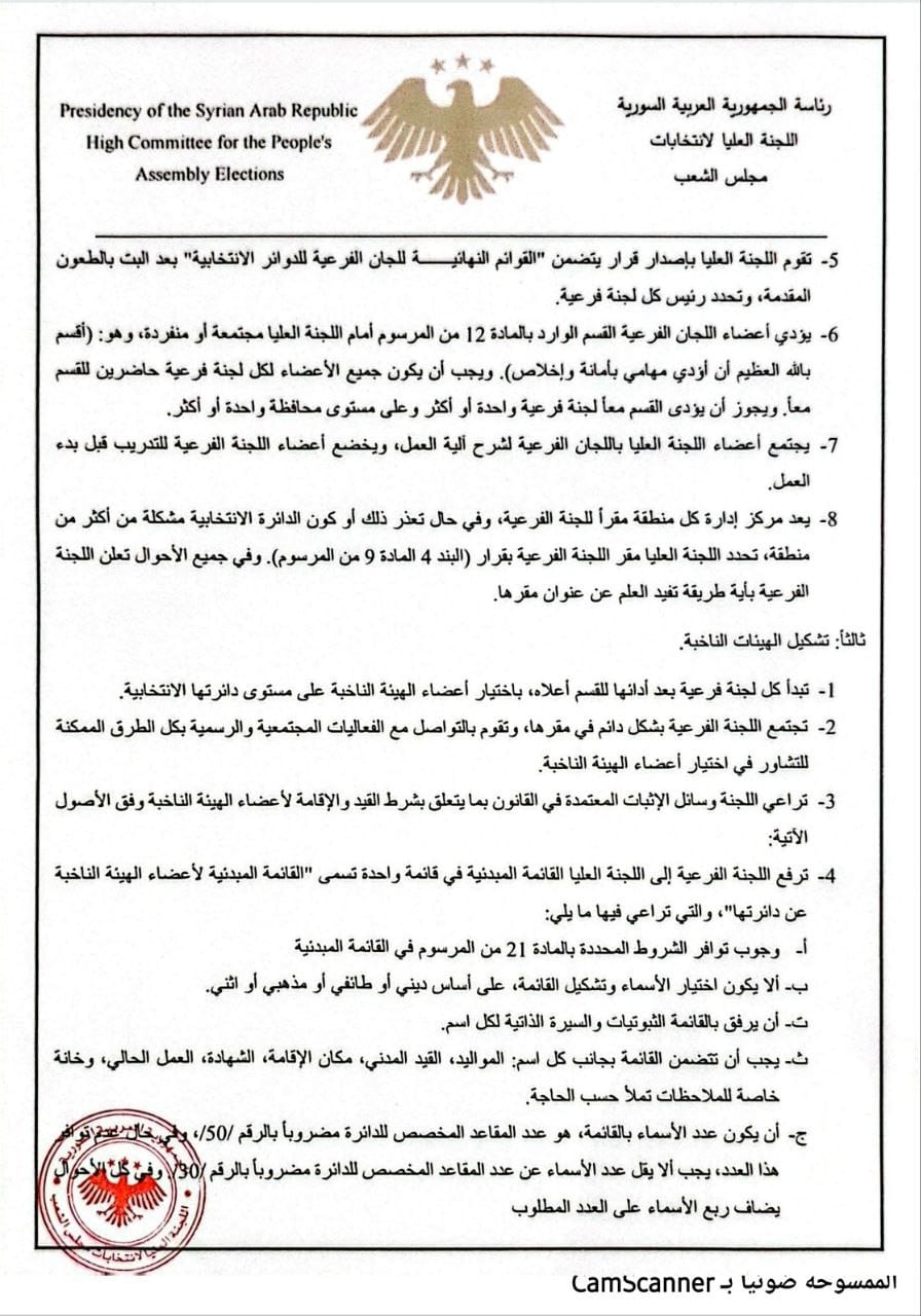 2- تقوم اللجنة العليا تطبيقاً للمادة 11 من المرسوم، بتشكيل اللجان الفرعية لكل دائرة انتخابية ويجب أن يكون عدد أعضاء كل لجنة فردي ولا يقل عن ثلاثة، ووفقاً للشروط التي يجب أن تتوافر في أعضاء اللجان الفرعية كما هو محدد بالمادة 10 من المرسوم))، وتعلن ذلك بقرار واحد على مستوى جميع المحافظات بدوائرها، ويتم تسمية قرارها بـ "القوائم الأولية لأعضاء اللجان الفرعية للدوائر الانتخابية".