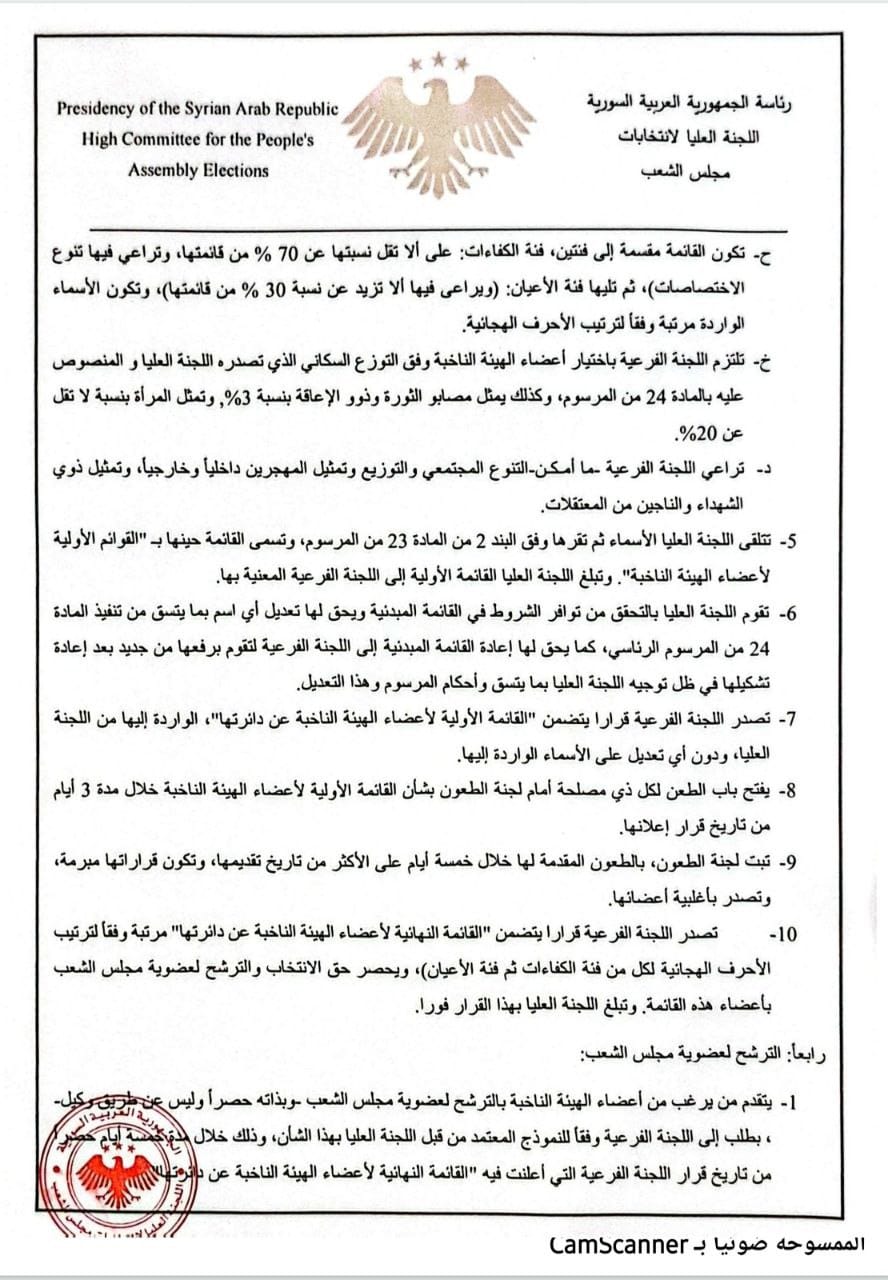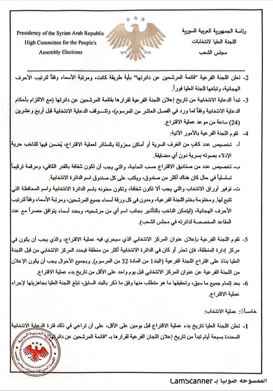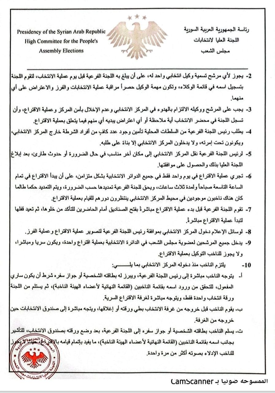 2- يجوز لرئيس اللجنة العليا، دعوة بعض البعثات الدبلوماسية ومكاتب المنظمات الدولية الحكومية المعتمدة في دمشق عن طريق إدارة المراسم بوزارة الخارجية والمغتربين للحضور إلى المراكز الانتخابية للاطلاع على سير عملية الاقتراع.