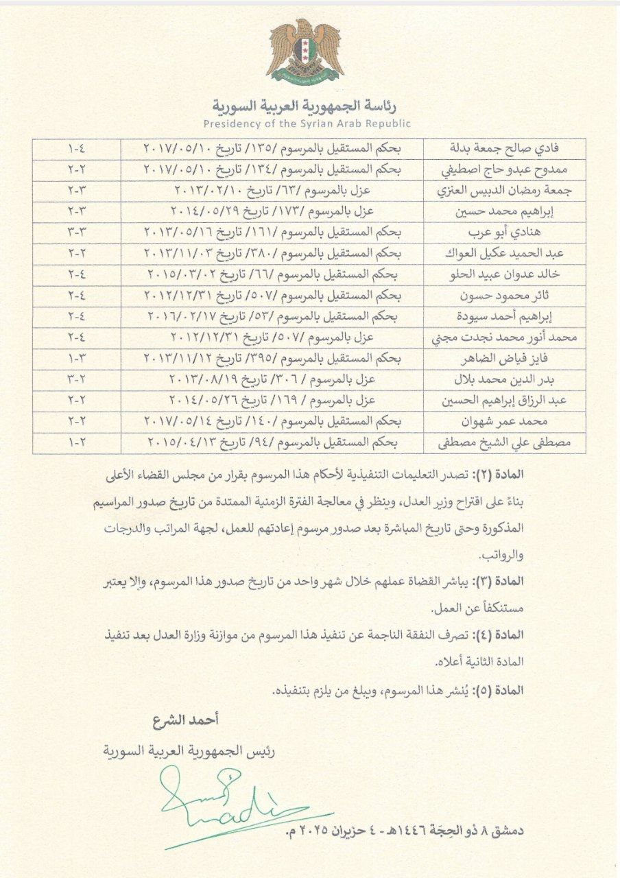 المرسوم 70 لعام 2025: طي مراسيم العزل وبحكم المستقيل الصادرة بحق قضاة