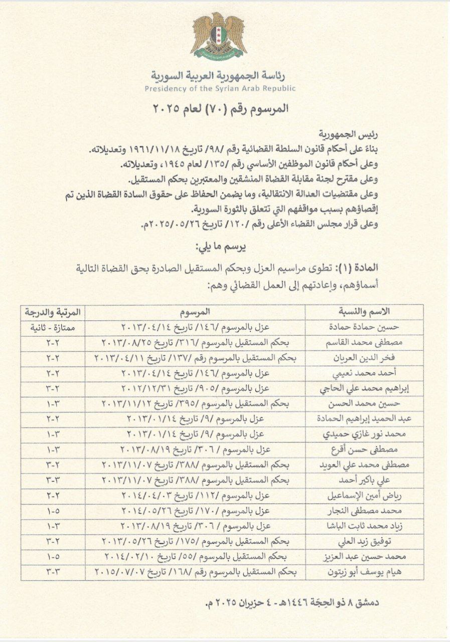 مرسوم رئاسي رقم (70) يقضي بطي مراسيم العزل وبحكم المستقيل الصادرة بحق القضاة التالية أسماؤهم وإعادتهم إلى العمل القضائي.