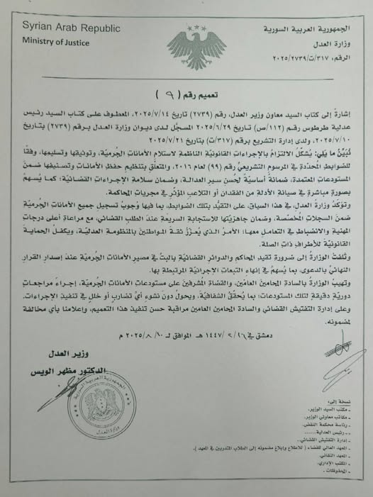 وزارة العدل: تعميم رقم 9 القاضي بضمان سلامة الإجراءات القضائية، مؤكدة ضرورة الالتزام بالقانون في استلام وتوثيق وتسليم الأمانات الجرمية ضمن المستودعات المختصة، حفاظاً على الأدلة ومنع العبث أو الضياع.