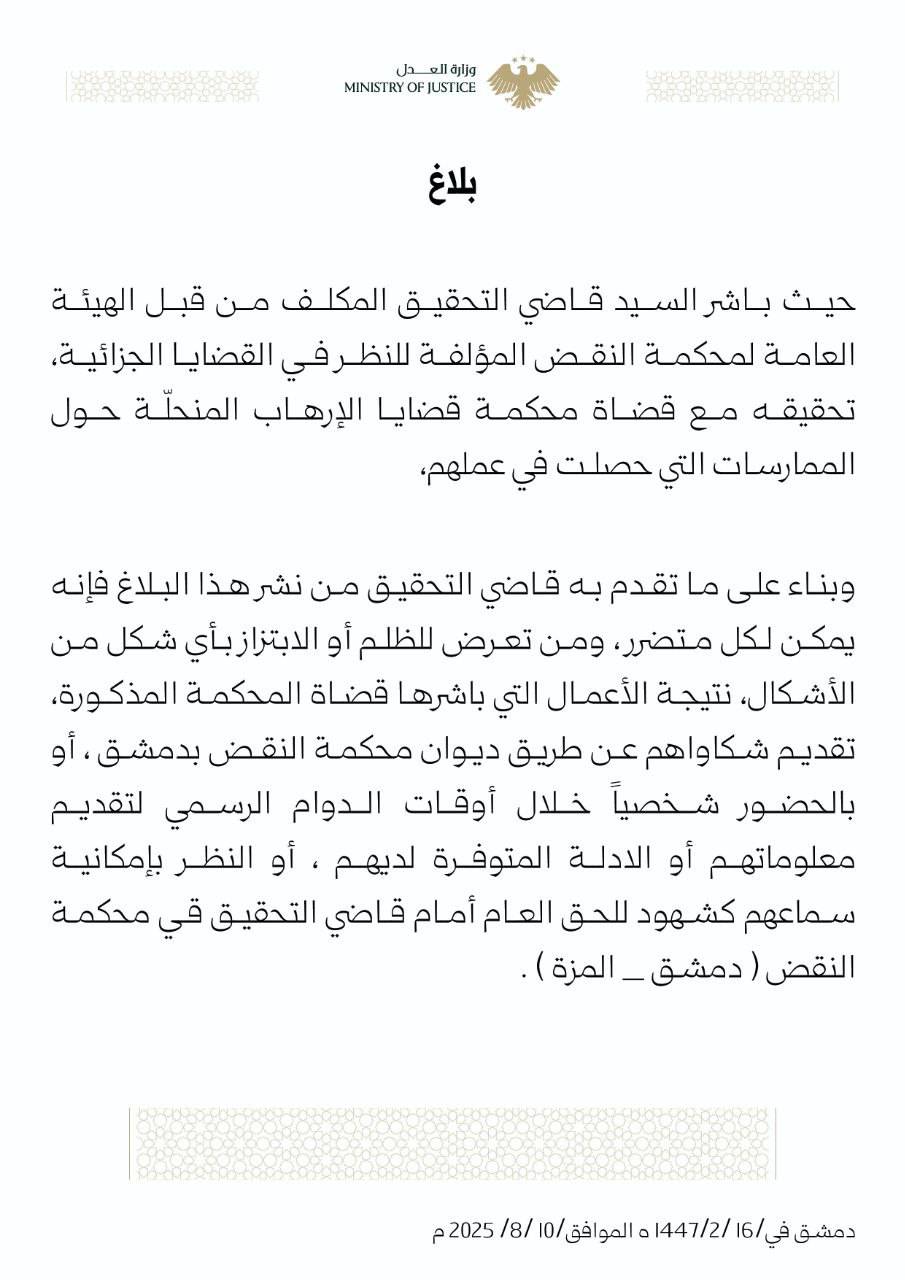 وزارة العدل: بلاغ يدعو المواطنين الذين تعرضوا للظلم أو الابتزاز نتيجة أعمال قضاة محكمة الإرهاب، إلى تقديم شكاويهم عبر ديوان محكمة النقض بدمشق، أو بالحضور الشخصي خلال أوقات الدوام الرسمي