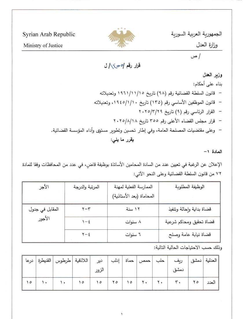 الإعلان عن الرغبة في تعيين عدد من السادة المحامين الأساتذة بوظيفة قاض، في عدد من المحافظات وفقا للمادة