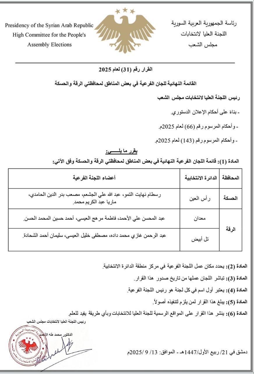 اللجنة العليا لانتخابات مجلس الشعب: القرار 31 لعام 2025 قائمة اللجان الفرعية النهائية في بعض المناطق لمحافظتي الحسكة والرقة.