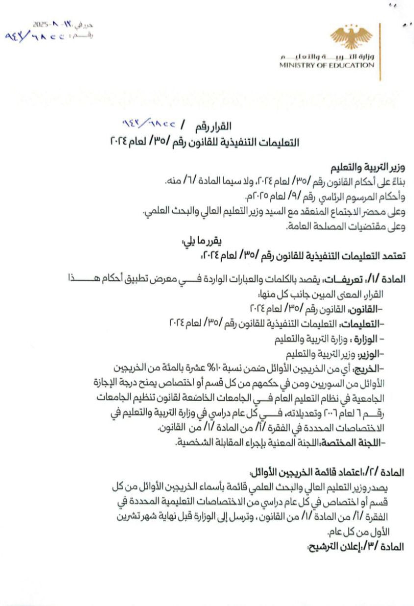 يصدر وزير التعليم العالي والبحث العلمي قائمة بأسماء الخريجين الأوائل من كل قسم أو اختصاص في كل عام دراسي من الاختصاصات التعليمية المحددة في الفقرة // من المادة // من القانون، وترسل إلى الوزارة قبل نهاية شهر تشرين
