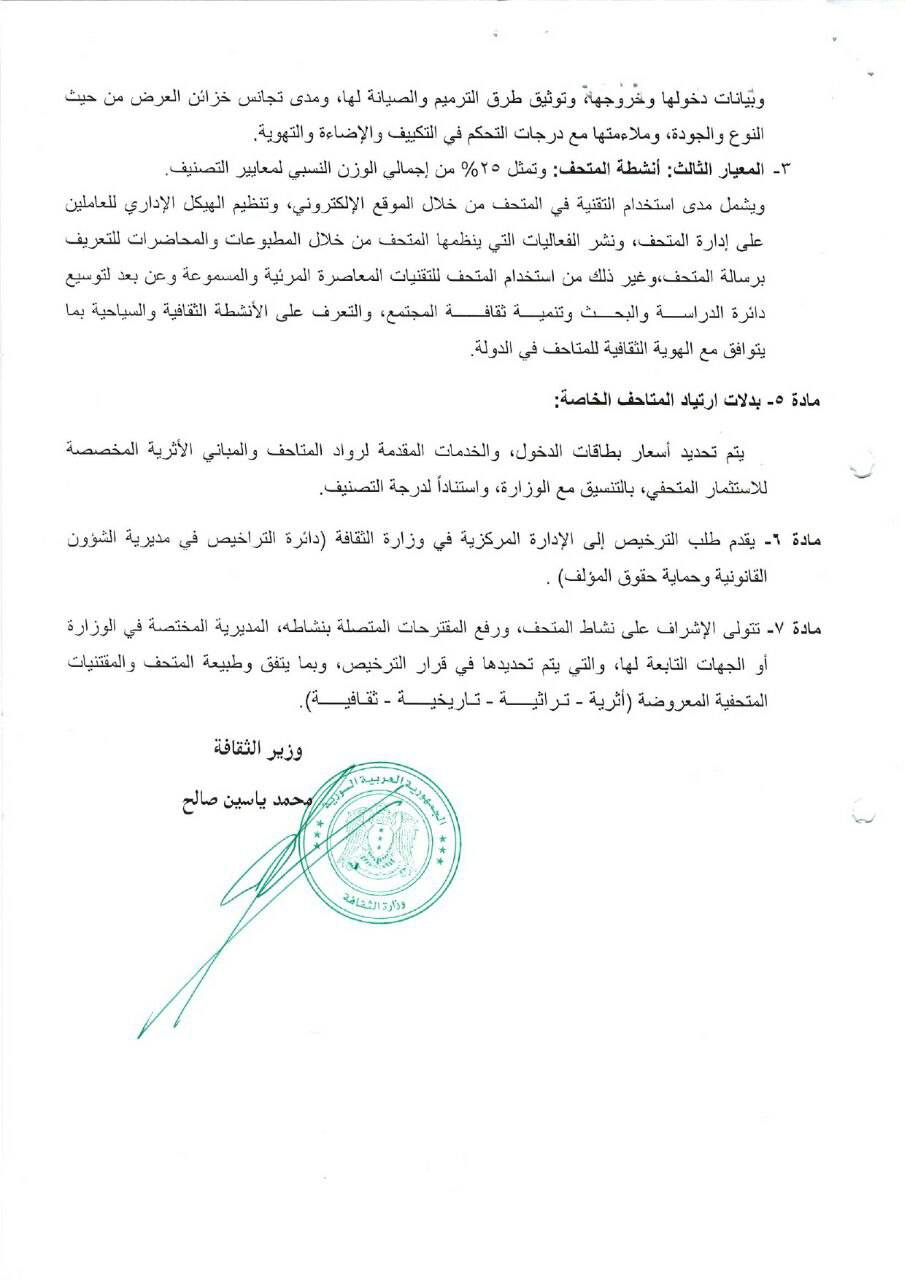 مادة - تتولى الإشراف على نشاط المتحف، ورفع المقترحات المتصلة بنشاطه المديرية المختصة في الوزارة أو الجهات التابعة لها، والتي يتم تحديدها في قرار الترخيص، وبما يتفق وطبيعة المتحف والمقتنيات المتحفية المعروضة أثرية - تراثية - تاريخية - ثقافية).