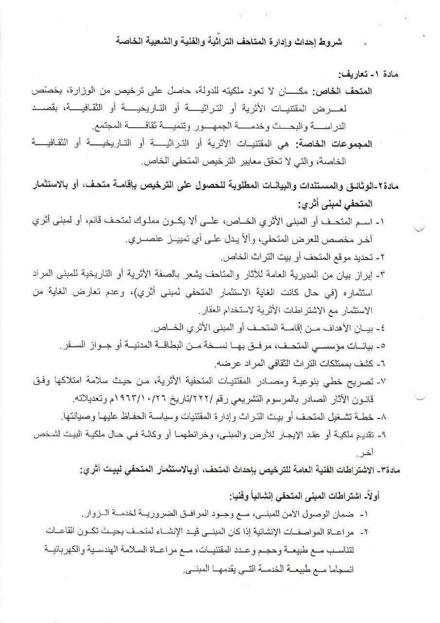 المادة الأولى: تعتمد الشروط المرفقة بهذا القرار لإحداث وإدارة المتاحف التراثية والفنية والشعبية الخاصة، وآلية الإشراف عليها.