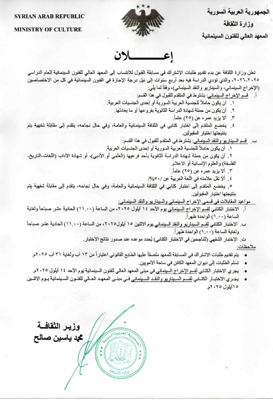 تعلن وزارة الثقافة عن بدء تقديم طلبات الاشتراك في مسابقة القبول للانتساب إلى المعهد العالي للفنون السينمائية للعام الدراسي ٢٠٢٥-٢٠٢٦ ، والذي تؤدي الدراسة فيه بعد أربع سنوات إلى نيل درجة الإجازة في الفنون السينمائية في كل من الاختصاصين