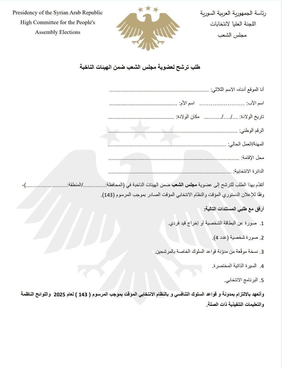 اللجنة العليا لانتخابات مجلس الشعب تُعمم على اللجان الانتخابية الفرعية في المحافظات نماذج طلبات الترشح لعضوية مجلس الشعب ضمن الهيئات الناخبة، ومدونة سلوك المترشح.