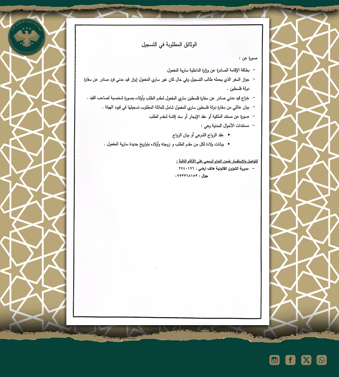 جواز السفر الذي يحمله طالب التسجيل وفي حال كان غير ساري المفعول إبراز قيد مدني فرد صادر عن سفارة دولة فلسطين .