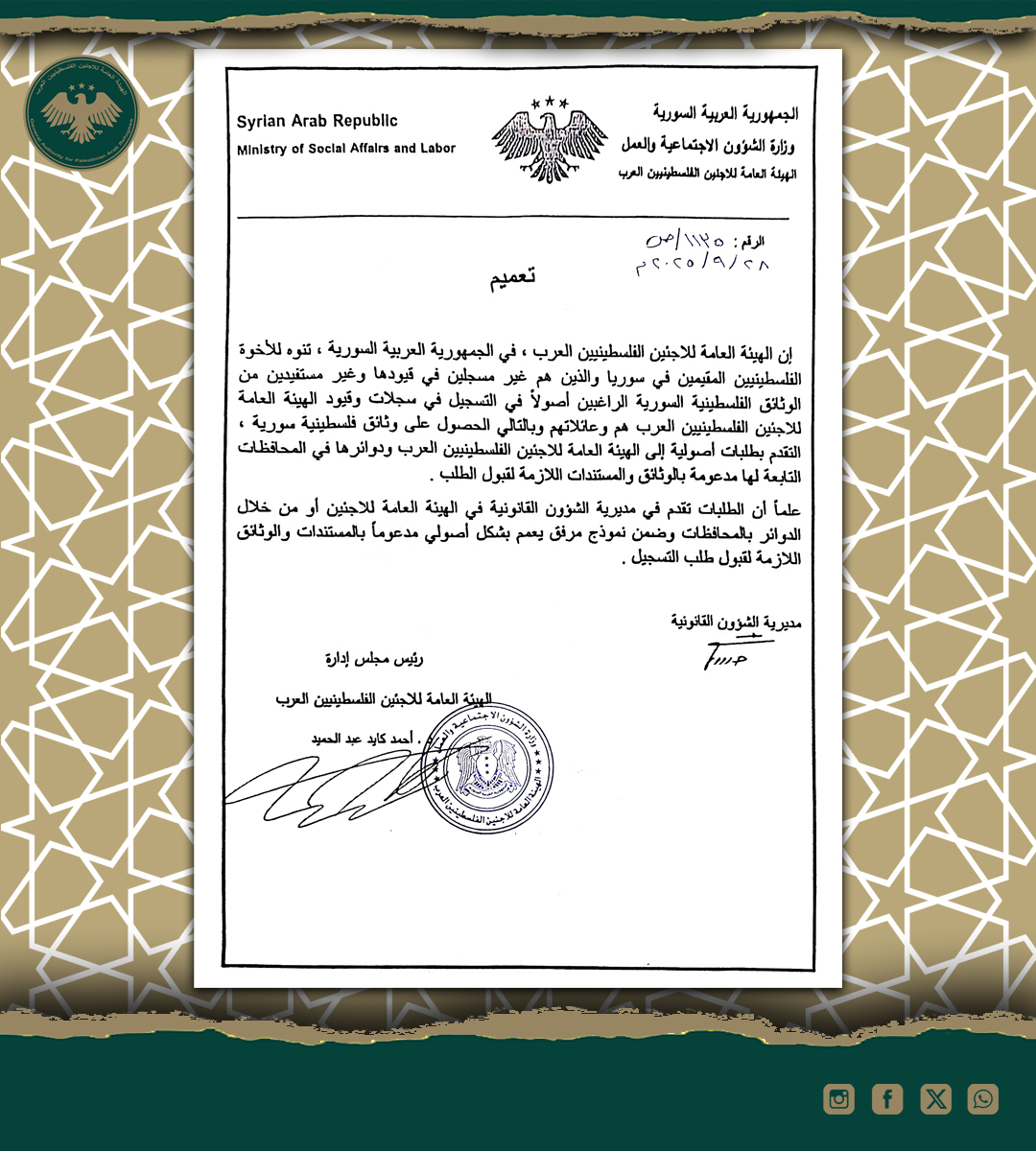 وزارة الشؤون الاجتماعية والعمل: تعميم صادر عن الهيئة العامة للاجئين الفلسطينيين العرب في سوريا بخصوص الفلسطينيين المقيمين في الجمهورية العربية السورية والذين هم غير مسجلين في قيودها، للمبادرة بالتسجيل في سجلات وقيود الهيئة