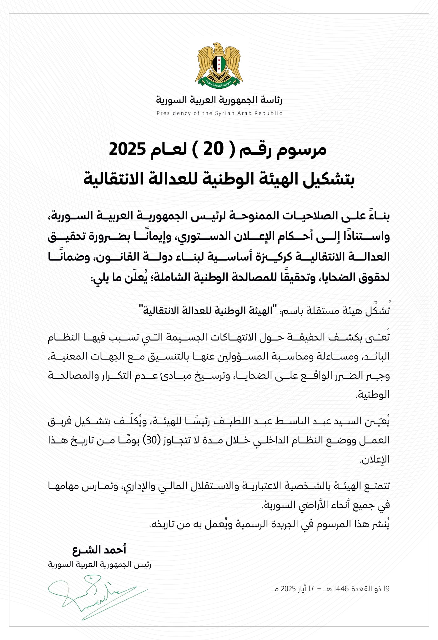 مرسوم رقم (20) لعام 2025 بتشكيل الهيئة الوطنية للعدالة الانتقالية