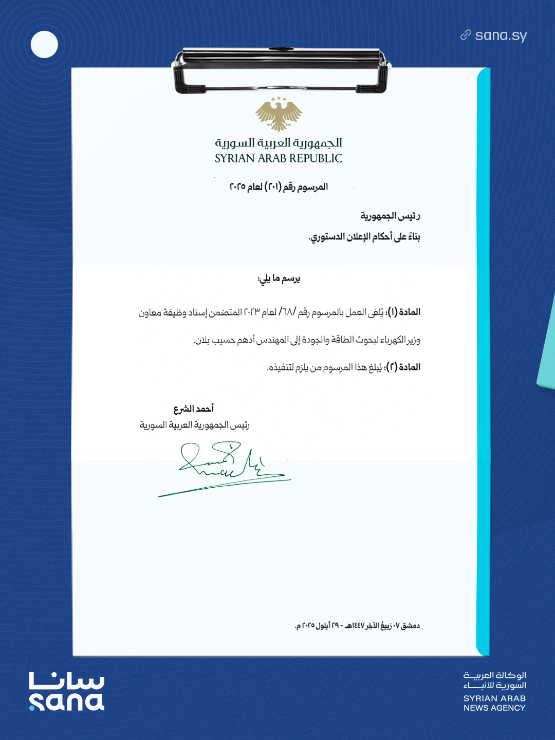 المادة (1): يُلغى العمل بالمرسوم رقم / 68 / لعام 2023 المتضمن إسناد وظيفة معاون وزير الكهرباء لبحوث الطاقة والجودة إلى المهندس أدهم حسيب بلان.
