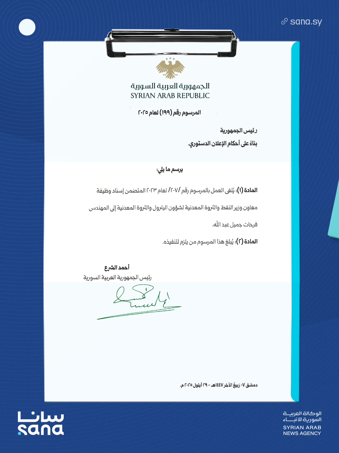 المادة (1): يُلغى العمل بالمرسوم رقم / 207 / لعام 2023 المتضمن إسناد وظيفة معاون وزير النفط والثروة المعدنية لشؤون البترول والثروة المعدنية إلى المهندس فرحات جميل عبد الله.
