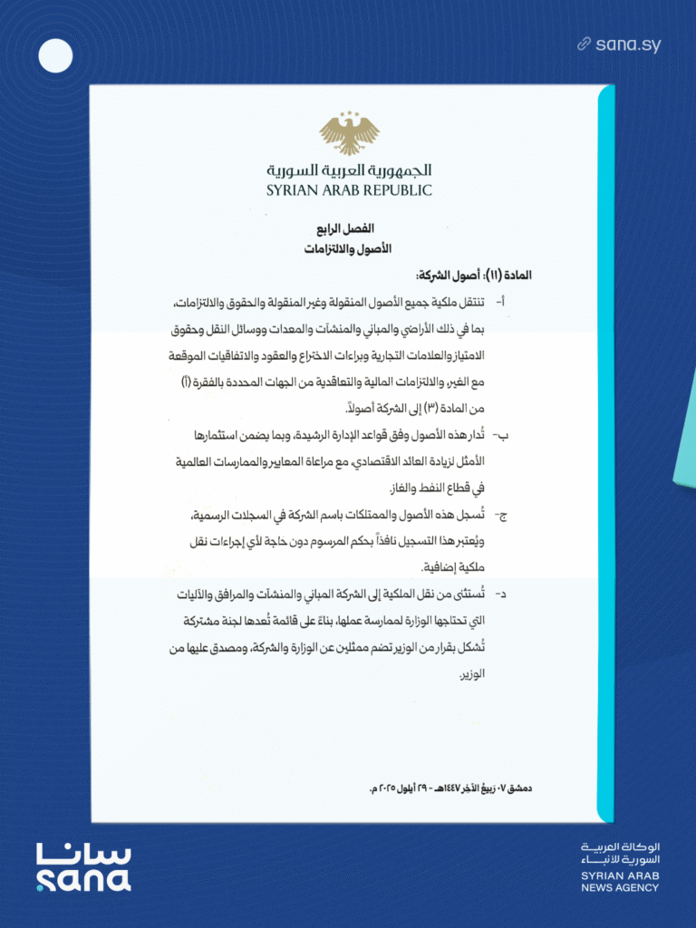 المادة (2): تُحدث في الجمهورية العربية السورية شركة عامة قابضة ذات طابع اقتصادي، مملوكة بالكامل للدولة تسمى “الشركة السورية للبترول SPC” تتمتع بالشخصية الاعتبارية والاستقلال المالي والإداري، مقرها دمشق.