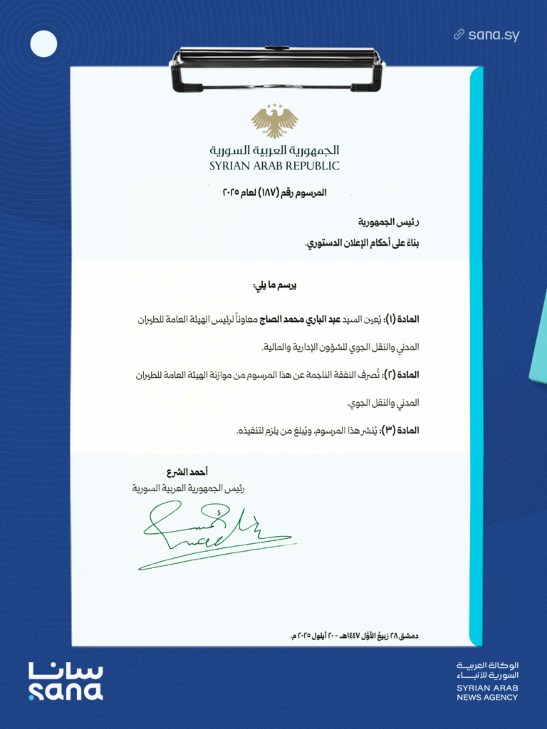 المرسوم رقم 187 لعام 2025: تعيين عبد الباري الصاج معاوناً لرئيس الهيئة العامة للطيران المدني