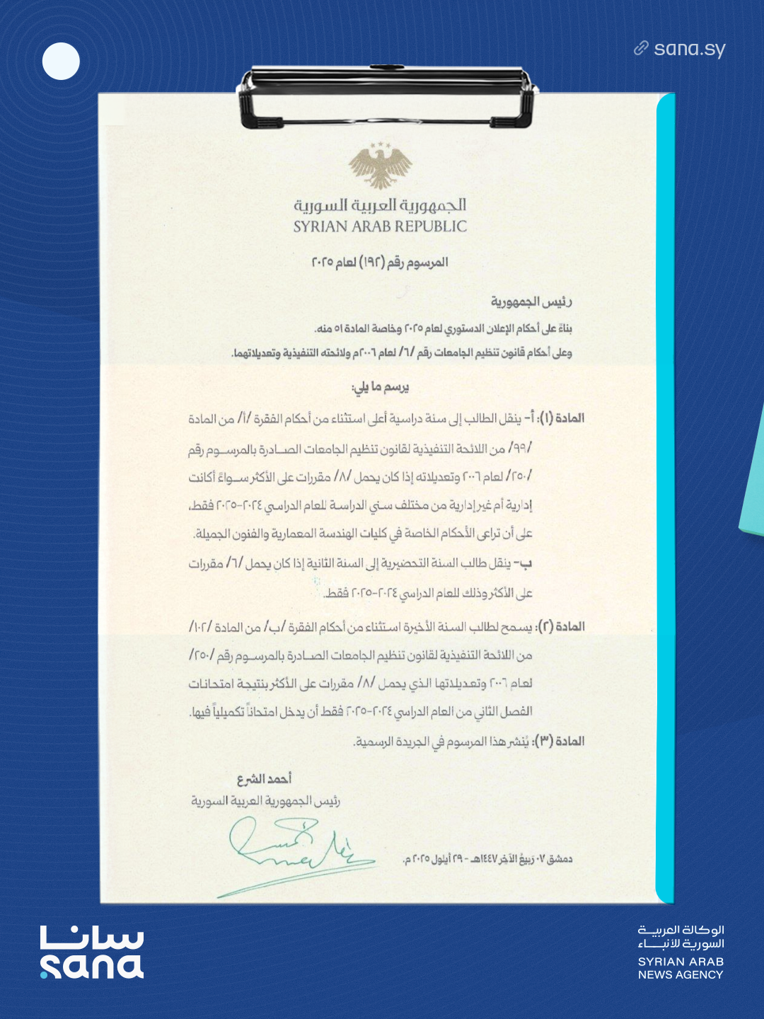 الرئيس الشرع يصدر مرسوماً يقضي بمنح ترفع إداري لطلاب الجامعات