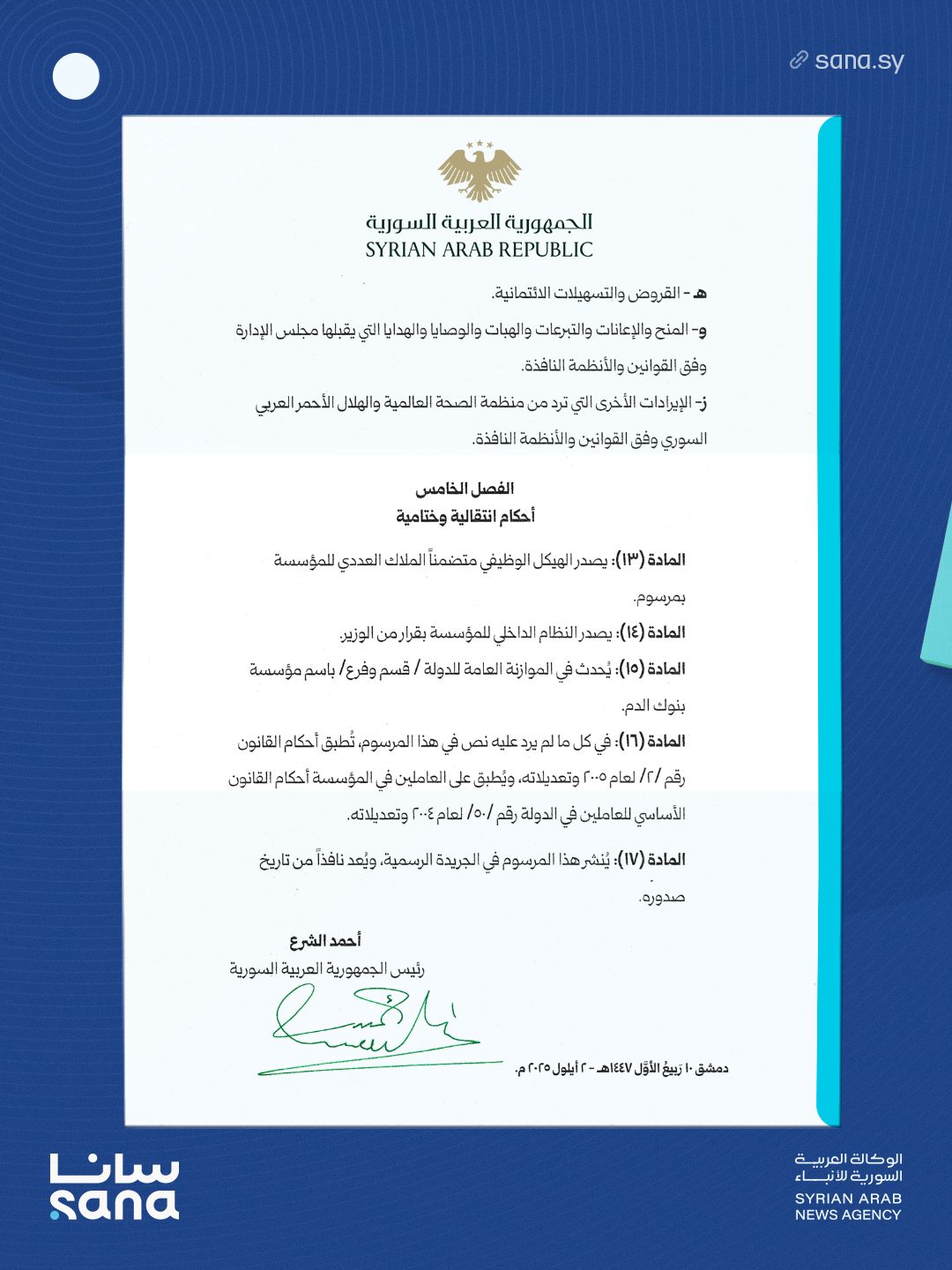 المادة (17): يُنشر هذا المرسوم في الجريدة الرسمية، ويُعد نافذاً من تاريخ صدوره.