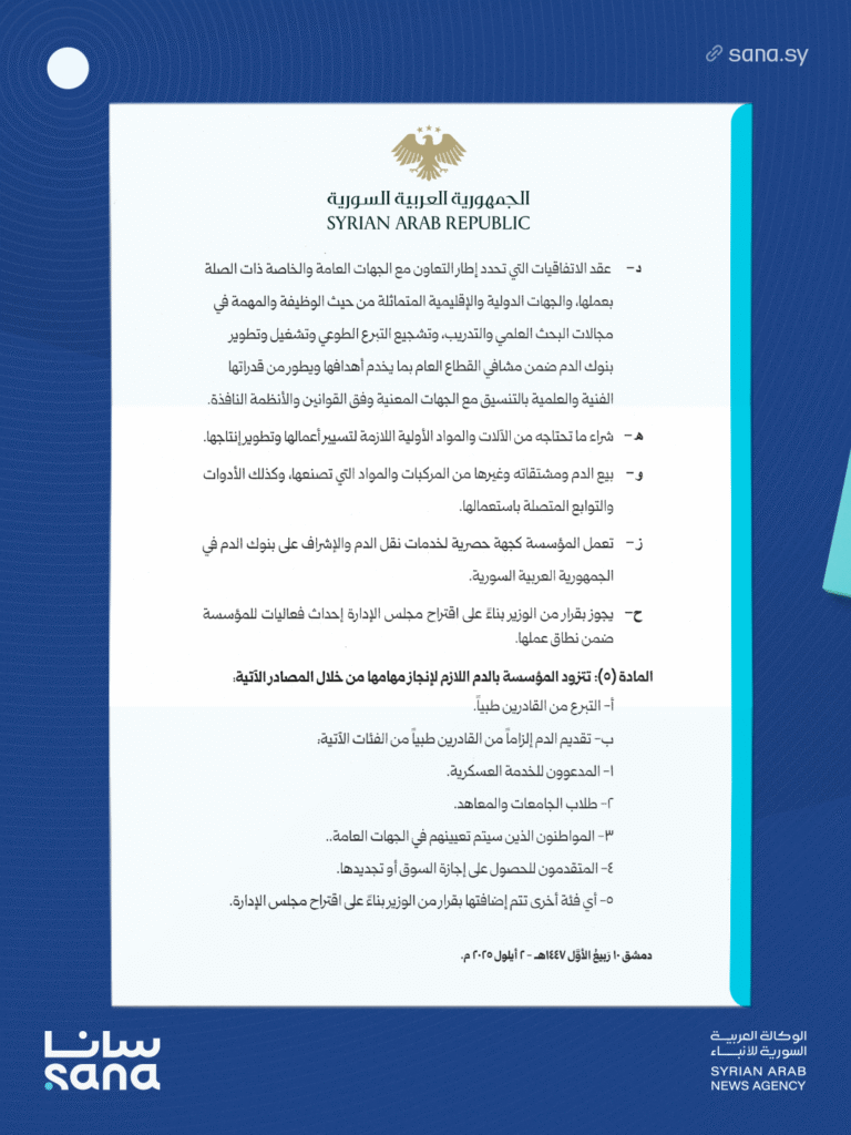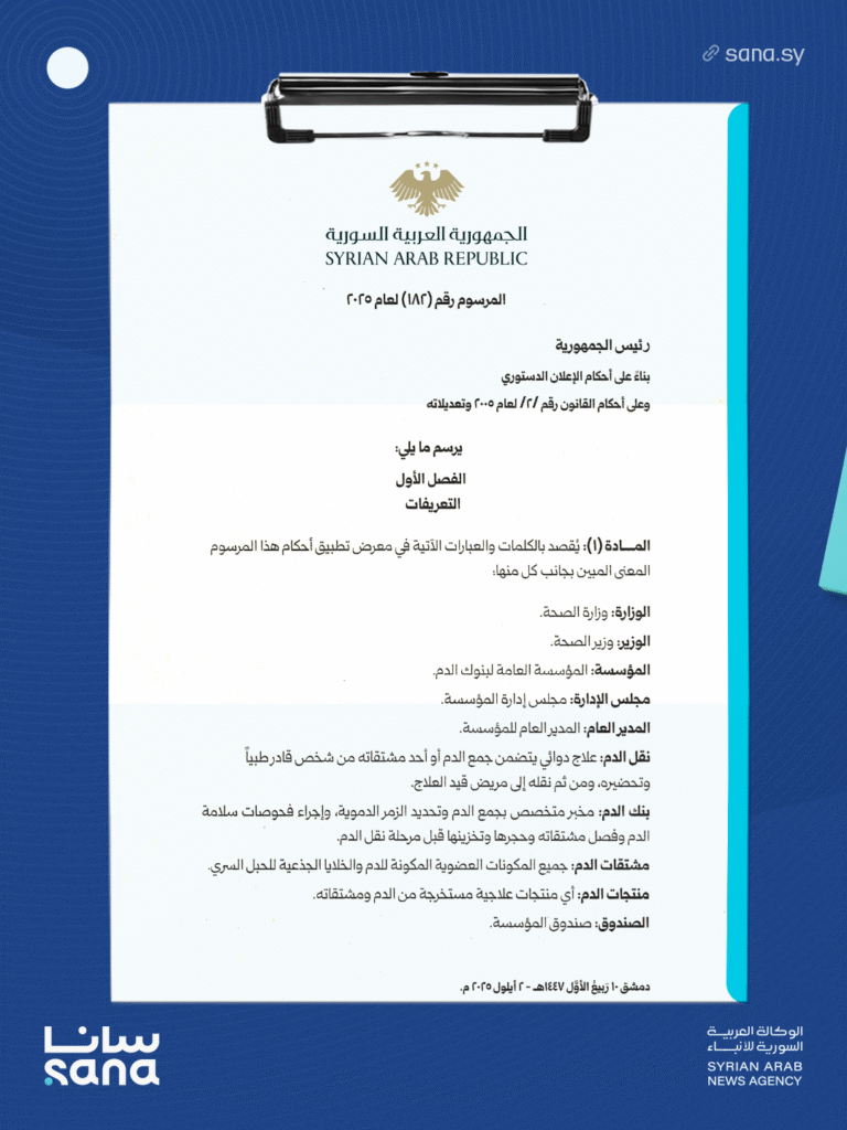المرسوم 182 لعام 2025: إحداث المؤسسة العامة لبنوك الدم