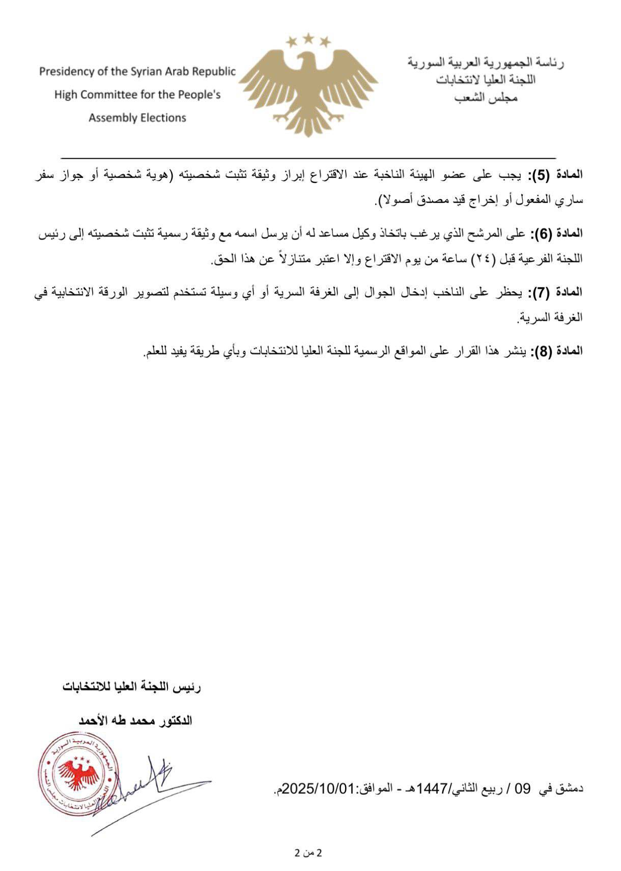 دمشق في 09 / ربيع الثاني / 1447هـ - الموافق: 2025/10/01م.