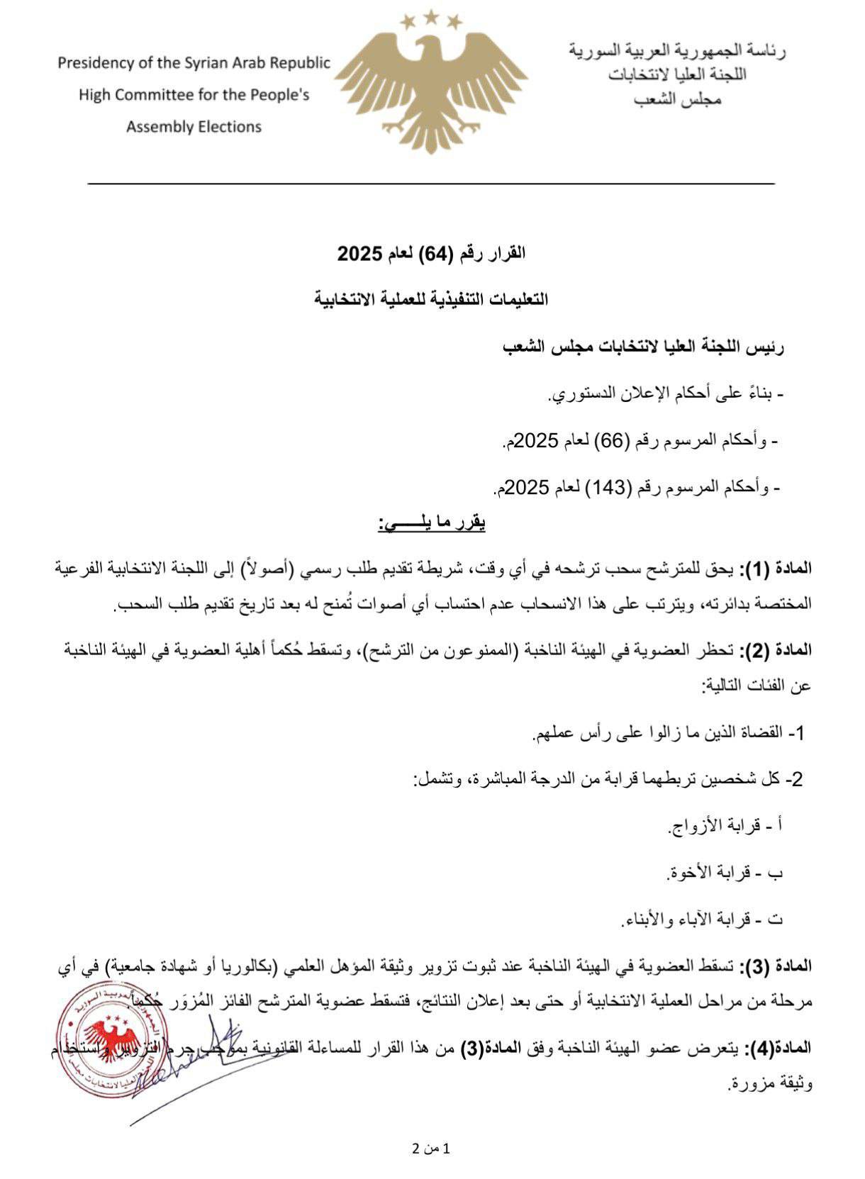 قرار رقم (64) لعام 2025، يبيّن بعض التعليمات التنفيذية للعملية الانتخابية.