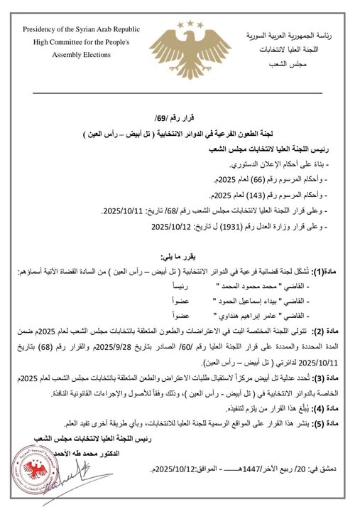 اللجنة العليا لانتخابات مجلس الشعب: قرار رقم 69 لعام 2025 تشكيل لجان الطعون للدوائر الانتخابية في تل أبيض - رأس العين
