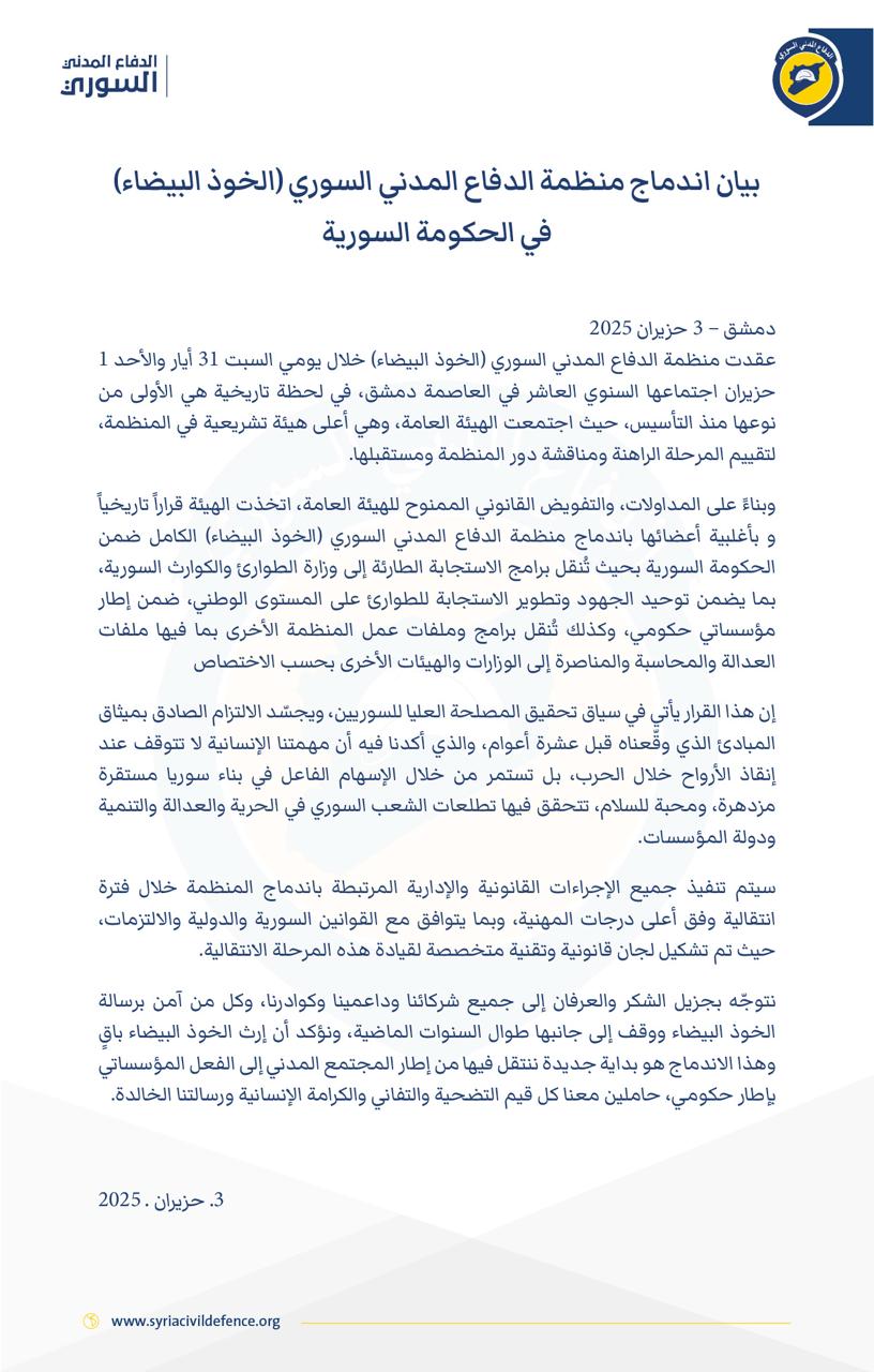 نتوجه بجزيل الشكر والعرفان إلى جميع شركائنا وداعمينا وكوادرنا، وكل من آمن برسالة الخوذ البيضاء ووقف إلى جانبها طوال السنوات الماضية، ونؤكد أن إرث الخوذ البيضاء باق وهذا الاندماج هو بداية جديدة ننتقل فيها من إطار المجتمع المدني إلى الفعل المؤسساتي بإطار حكومي، حاملين معنا كل قيم التضحية والتفاني والكرامة الإنسانية ورسالتنا الخالدة.