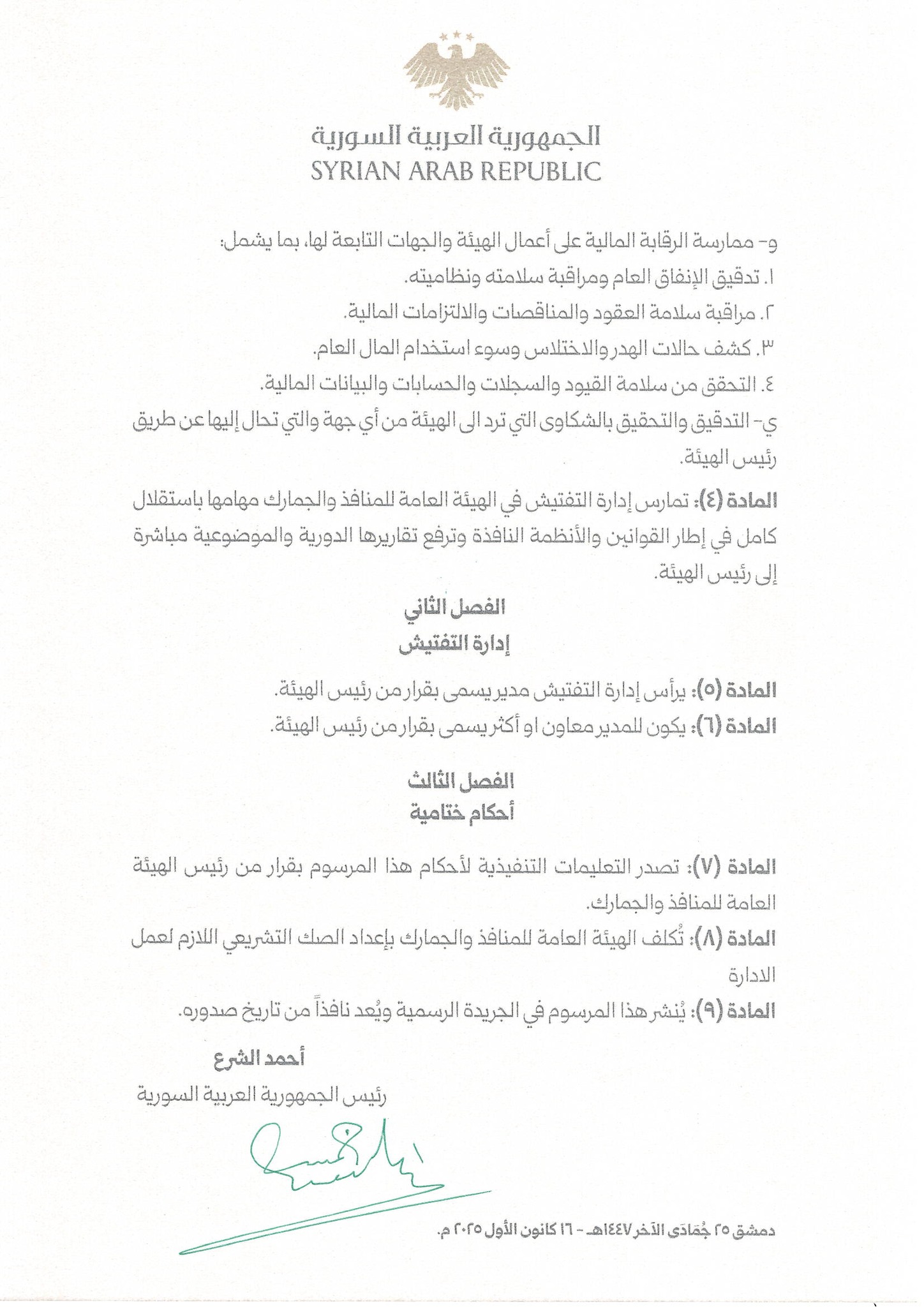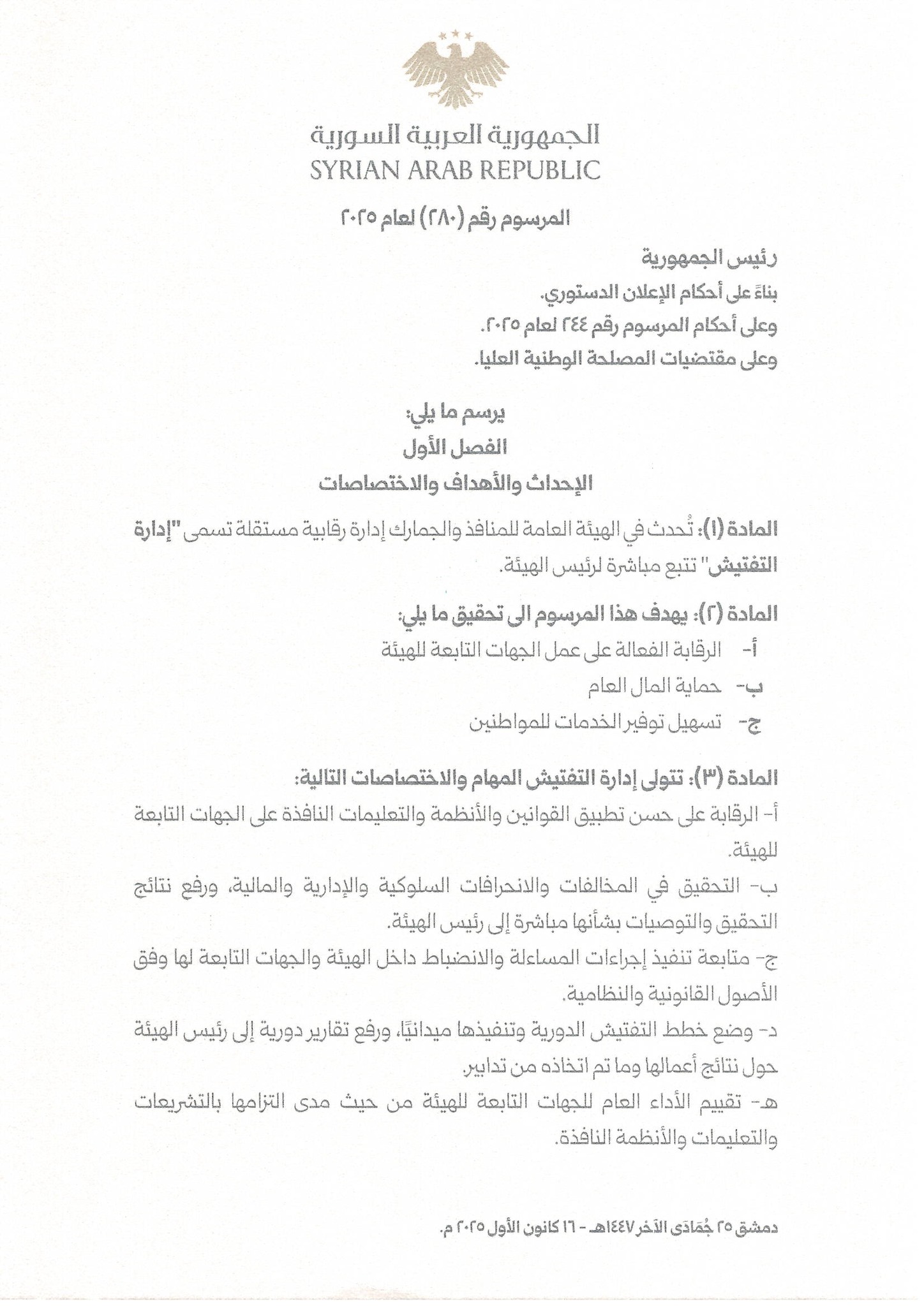 مرسوم صادر عن رئيس الجمهورية العربية السورية لعام 2025، يقضي بإحداث إدارة رقابية مستقلة باسم “إدارة التفتيش” ضمن الهيئة العامة للمنافذ والجمارك، تتبع مباشرة لرئيس الهيئة، ويحدد أهدافها واختصاصاتها في مجالات الرقابة الإدارية والمالية والتحقيق في المخالفات وحماية المال العام، إضافة إلى تنظيم هيكليتها وآلية عملها وصلاحياتها، مع بيان الأحكام التنفيذية والنفاذ القانوني للمرسوم.