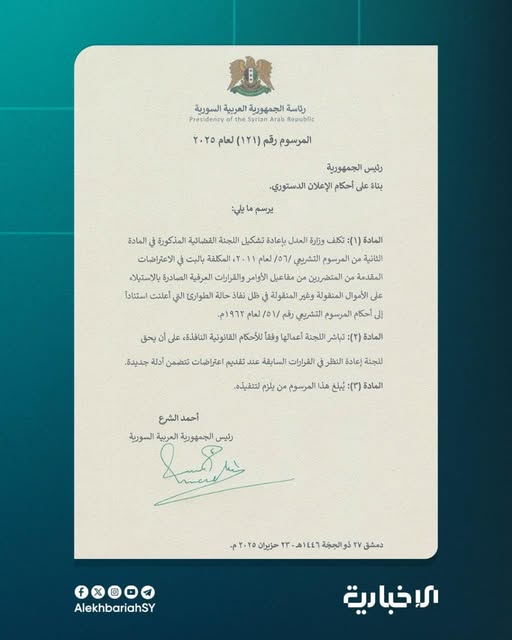 لسيد الرئيس أحمد الشرع يصدر المرسوم رقم (121) للعام 2025 القاضي بتكليف وزارة العدل بإعادة تشكيل اللجنة القضائية المكلفة بالبت في الاعتراضات المقدمة من المتضررين من مفاعيل الأوامر والقرارات العرفية الصادرة بالاستيلاء على الأموال المنقولة وغير المنقولة في ظل نفاذ حالة الطوارئ التي أعلنت استناداً إلى أحكام المرسوم التشريعي رقم 51 للعام 1962م