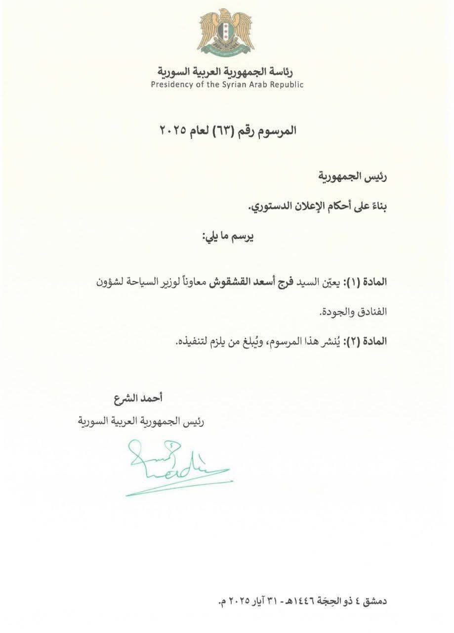 الرئيس الشرع يصدر المرسوم رقم 63 يقضي بتعيين "فرج القشقوش" معاوناً لوزير السياحة لشؤون الفنادق والجودة.