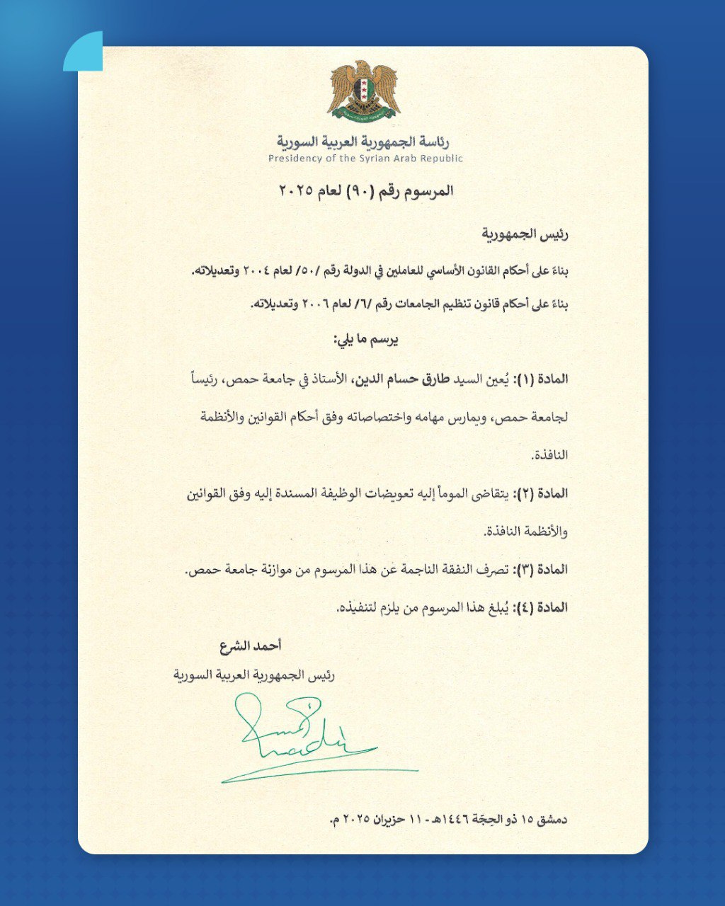 المرسوم 90 لعام 2025: تعيين طارق حسام الدين رئيساً لجامعة حمص